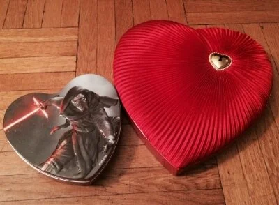 Both of my kids wanted heart-shaped boxes for Valentine's Day and I was more than happy to oblige. Here's a pic of their two boxes: an interesting dichotomy of the light and dark sides. (Yes, we're also big Star Wars fans).